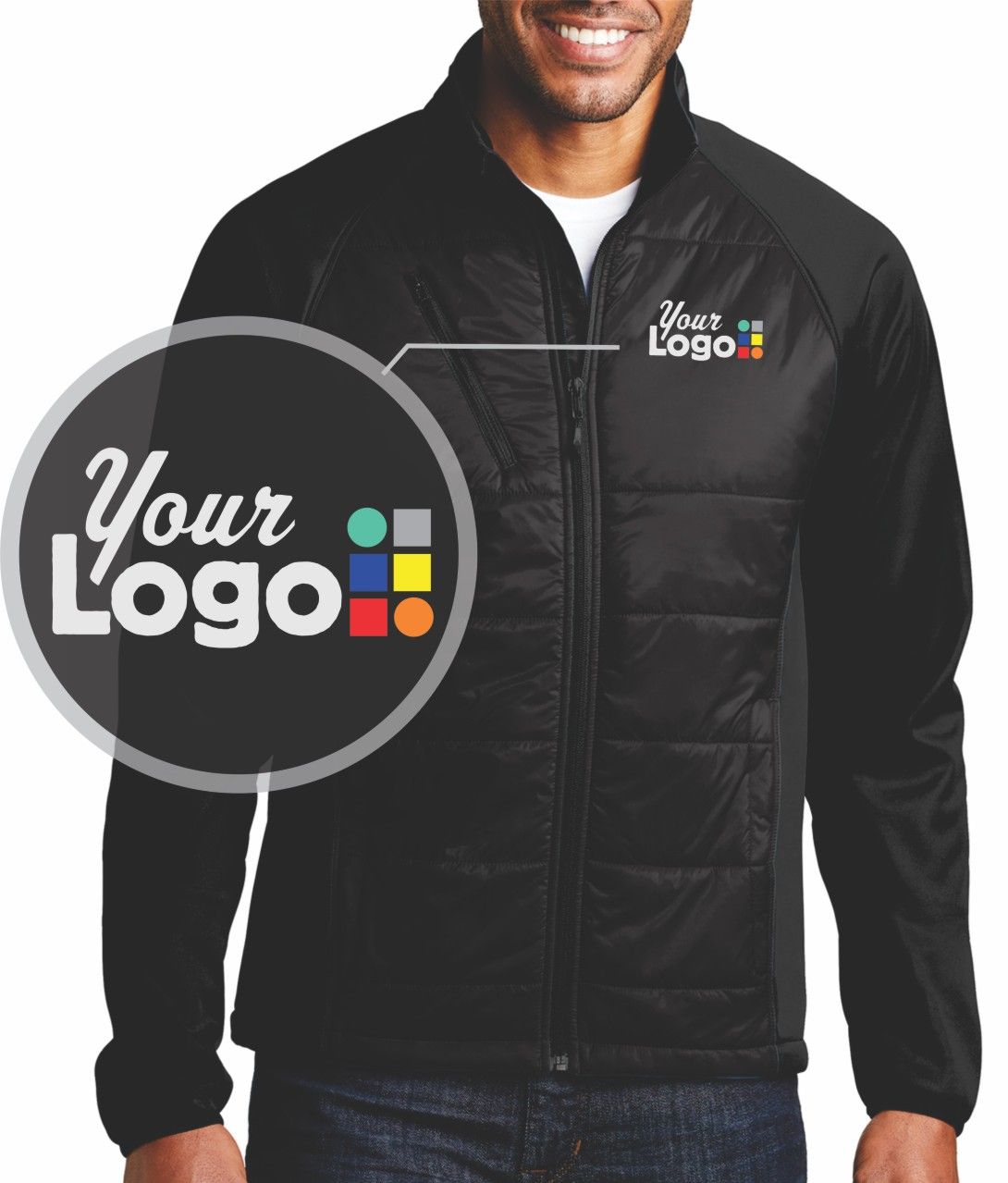Quilted front and back panels join a water-resistant soft shell to make the Hybrid a trend-right performance jacket with an urban edge. 100% polyester knit shell bonded to a water-resistant film insert and a 100% polyester microfleece interior; 100% nylon woven overlays with quilted 4-ounce, 100% poly fill insulation at center front and back panels; Reverse coil zippers: Zip-through cadet collar with chin guard; Zippered right chest pocket; Front zippered pockets; Left chest Port Pocket for easy embroidery access; Comfort fit binding at cuffs; Open hem with adjustable locking drawcords; Due to the nature of cotton/polyester blends in dark colors, special care must be taken throughout the decoration process when heat is applied for curing. Comes with logo of your choice to be embroidered on left chest; free setup; 6 minimum, Turnaround Time 10-12 days