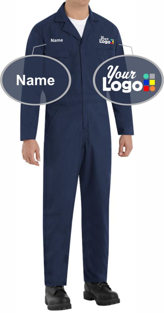 Mens style, Long Sleeve Speedsuit Fabric: 5.25 oz. Poplin. Blend: 65% Polyester / 35% Combed cotton. Finish: Pre cure durable press w/ soil release & wickable finish. Closure: Two way brass zipper. Collar: One piece topstitched. Pocket: Two set in front pockets, two breast pockets, two patch hip pockets (right breast pocket has functional flap). Other: Safety stitched mainseams. Action back. Elastic waist inserts. sku: CP30 Mens L/S Speedsuit Industrial Coverall, brand: Redkap; comes w/ logo on left chest and personal name on right chest Embroiderd (stitched), business name can be logo or font logo with NO aditional charge for setup, 6-10 days turnaround time.