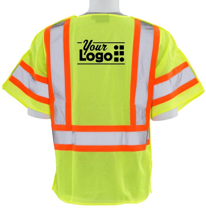 100% polyester mesh, Class 3, 2-inch silver reflective tape backed by contrasting trim, velcro front closure, mic tab on left side, 2 interior waist pockets with hook & loop closure, front and back are assebled with velcro on sides and shoulders and can completely be seperated away, comes with 1-color custom logo on back, printing application; turnaround time 8-12 days, 6 minimum vests