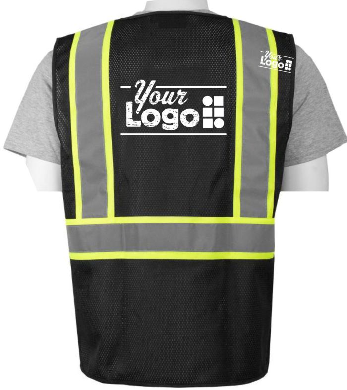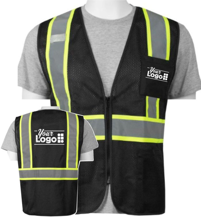 Non-ANSI Black Mesh with Zipper Front Closure and Contrasting AwareLite Reflective Trim; 2? silver reflective tape backed by contrasting trim; Zipper front closure; 100% Polyester mesh; comes with 1-color custom logo on front & back, printing application; turnaround time 8-12 days, 6 minimum vests.